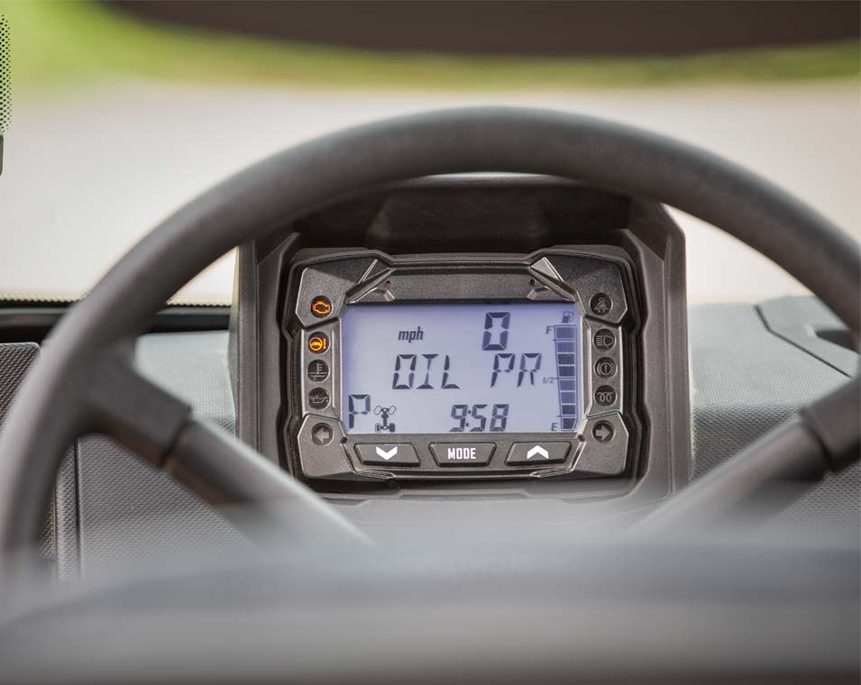 All Digital Gauge, Speedometer, Odometer, Tachometer, 2 Tripmeters, Hour Meter, Gear Indicator, Fuel Gauge, Engine Temperature, Hi-Temp Light, Clock, Clutch Belt Slip Warning, Glow Plug Indicator, Low Oil Pressure Indicator, Seat Belt Indicator, Parking Brake Engaged Alarm