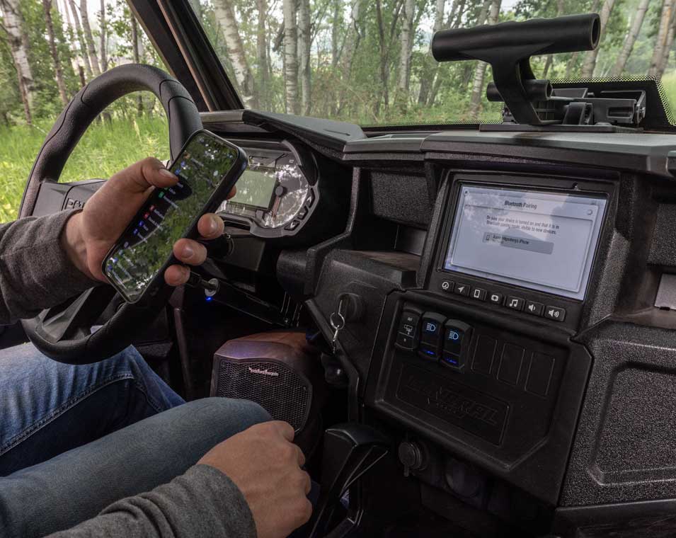 Dual-sweep Analog Dials w/ 4" LCD Rider Information Center: User Selectable Blue/Red Backlighting & Brightness, Programmable Service Intervals, Speedometer, Tachometer, Odometer, Tripmeter, Clock, Hour Meter, Gear Indicator, Fuel Gauge, Coolant Temperature, Voltmeter, Service Indicator and Codes, Seat Belt Reminder Light, Gear Indicator, DC Outlet, POLARIS HD 4500 LB Winch w/ Synthetic Rope, Aluminum Fairlead & Rubber Isolator Sport Low Profile Front Bumper ProFit Sport Roof